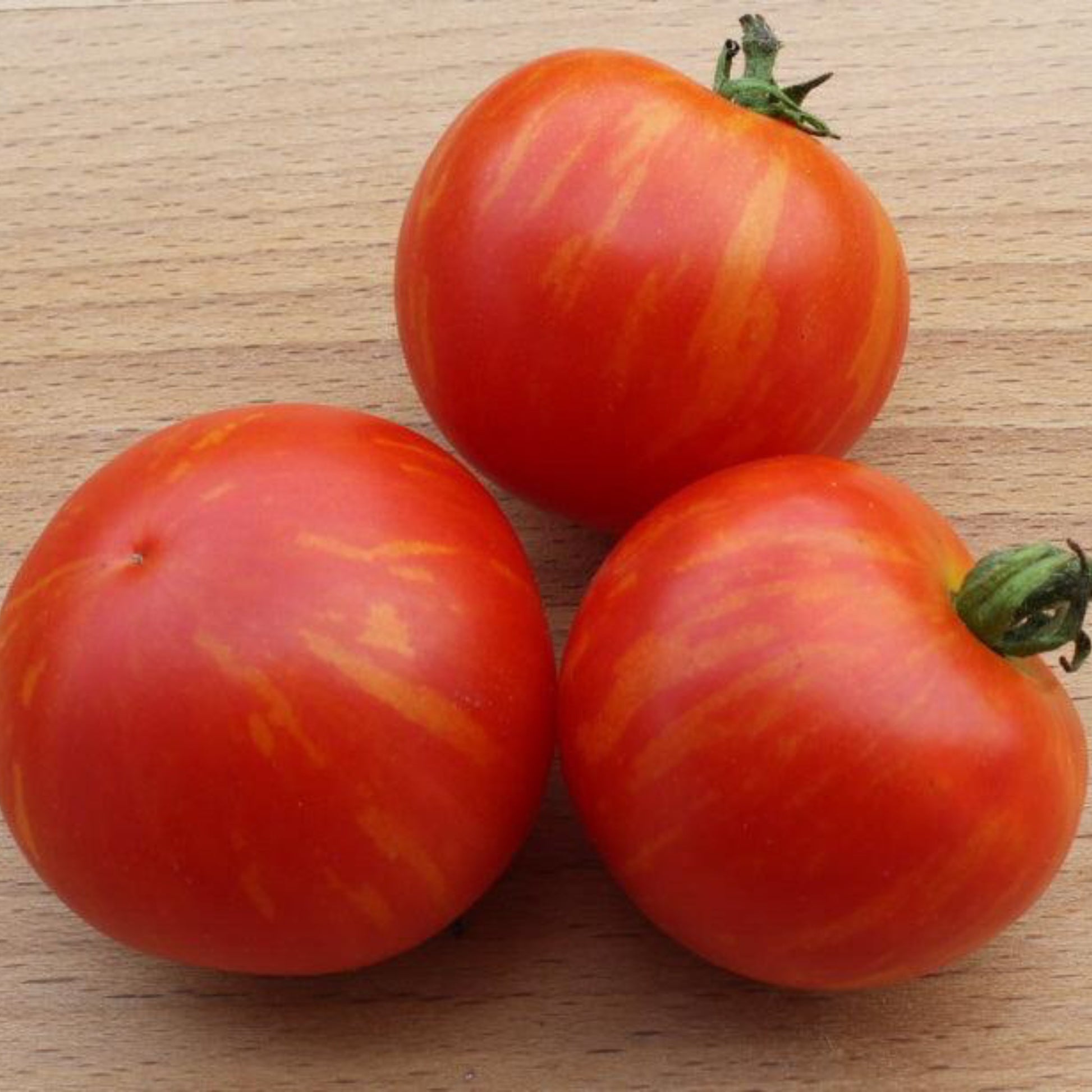 Solanum lycopersicum. Heirloom. Amurskiy Tigr Tomato with striped skins and tangy-sweet flavor.